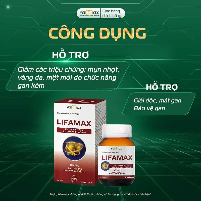 Giải độc gan Lifamax là một trong những sản phẩm được nhiều người lựa chọn, với các thành phần như Glutathione, Silymarin, cao Actiso, L-Ornithine L-Aspartate… có công dụng hỗ trợ giải độc gan, mát gan và bảo vệ gan, giúp hỗ trợ chăm sóc gan song song với việc duy trì lối sống và dinh dưỡng lành mạnh.