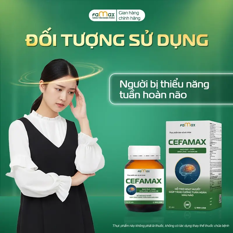 Cefamax là thực phẩm bảo vệ sức khỏe với công dụng hỗ trợ hoạt huyết, giúp tăng cường tuần hoàn máu não, từ đó hỗ trợ giảm các triệu chứng chóng mặt, đau đầu, mệt mỏi do thiểu năng tuần hoàn não. Sản phẩm không phải là thuốc và không có tác dụng thay thế thuốc chữa bệnh; người dùng nên kết hợp điều chỉnh lối sống và tham khảo ý kiến chuyên gia y tế khi cần thiết.