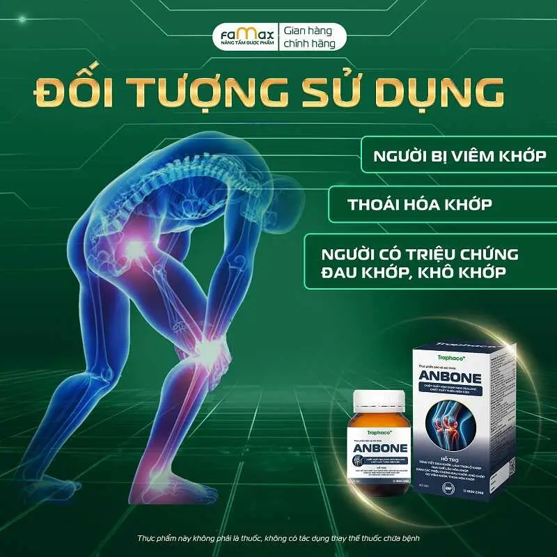 Bên cạnh các phương pháp điều trị và kiểm soát triệu chứng gai khớp gối, việc dưỡng khớp và hỗ trợ sức khỏe khớp từ bên trong đóng vai trò quan trọng trong quá trình chăm sóc lâu dài. Anbone là thực phẩm bảo vệ sức khỏe được với công dụng hỗ trợ tăng tiết dịch khớp, giúp làm trơn ổ khớp và hỗ trợ hạn chế lão hóa khớp.