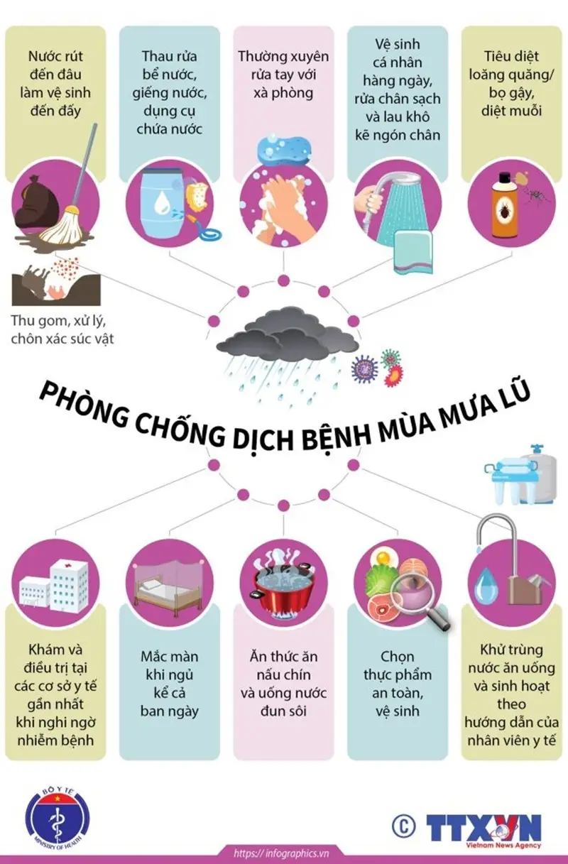 Ngoài ra, nguy cơ mắc các bệnh do ký sinh trùng, côn trùng truyền bệnh cũng tăng cao. Rết, muỗi, ruồi, ve… đều có thể phát triển mạnh trong điều kiện ẩm ướt, gây ra các bệnh như sốt rét, sốt xuất huyết, và các bệnh truyền nhiễm khác. Trong mùa mưa bão năm 2025, dự báo khí hậu còn diễn biến phức tạp hơn, khả năng các dịch bệnh có chiều hướng gia tăng.