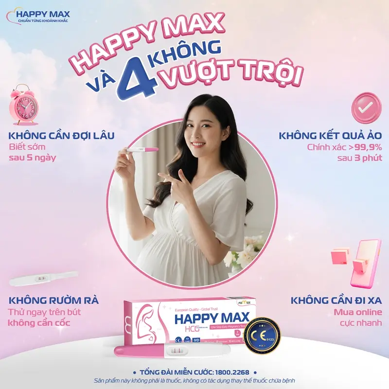 Bút thử thai HCG Happy Max là bộ kit thử thai được với mục đích sử dụng phát hiện hormone hCG trong nước tiểu, hỗ trợ nhận biết thai kỳ sớm với độ chính xác >99,9%, giúp phát hiện thai kỳ sớm từ khoảng 7 ngày sau thụ thai, khi nồng độ hormone hCG đạt ngưỡng phát hiện. Thời gian cho kết quả nhanh, chỉ từ 3–5 phút, thao tác sử dụng đơn giản, thuận tiện để tự kiểm tra tại nhà.